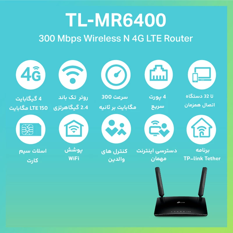 مودم MR6400 یک محصول با کیفیت از شرکت تیپی-لینک (TP-LINK) است که تنها با قرار دادن یک سیم کارت نسل چهارم (4G) در آن میتوانید از اینترنت پرسرعت استفاده کنید. این مودم روتر از دو آنتن با 2.4 گیگاهرتزی داخلی برای ایجاد شبکه Wi-Fi و دو عدد آنتن بیرونی برای اتصال به آنتنهای BTS اپراتور بهره می برد و با این ترکیب این دو مجموعه آنتن، میتواند اینترنت سیمکارت شما را به صورت بیسیم در محیط اطرافتان ارایه دهد. برای استفاده از MR6400 تنها کافی است که سیمکارت خود را در مکان مشخص شده قرار دهید و به کمک آداپتور 12 ولتی موجود در جعبه، محصول آن را به برق شهری متصل کنید. در پنل پشتی مودم روتر، چهار عدد پورت LAN از نوع 10/100 مگابیتی وجود دارد که یکی از آنها پورت LAN/WAN است. این پورت به شما کمک میکند دستگاههایی از قبیل مودم کابلی (فاقد قابلیت وایرلس) را به این دستگاه جدید وصل و به کمک آن حتی از اینترنت ADSL هم استفاده کنید. بدون شک مودم 4G تیپی-لینک مدل MR6400 یک محصول نیمه حرفهای است که در واقع نسخهی ساده شدهی Archer MR200 از همین برند است. تفاوت اصلی این دو مدل، پشتیبانی از شبکه بیسیم 5 گیگاهرتز و استاندارد IEEE 802.11ac در مدل Archer MR200 است که در مدل MR6400 به شبکه 2.4 گیگاهرتز و استاندارد IEEE 802.11n تقلیل پیدا کردهاست.
